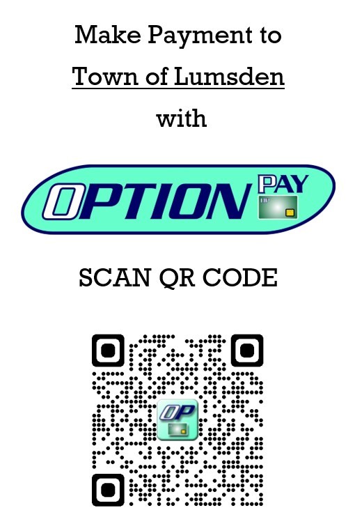 The Town of Lumsden has partnered with OptionPay. Using the Town's OptionPay, credit cards can be used to securely to pay for things such as property taxes, tickets and fines, utility bills, rental fees, permits and deposits and other accounts receivable invoices. There is a fee for this service. Click HERE to review the tiered fee rate table.
