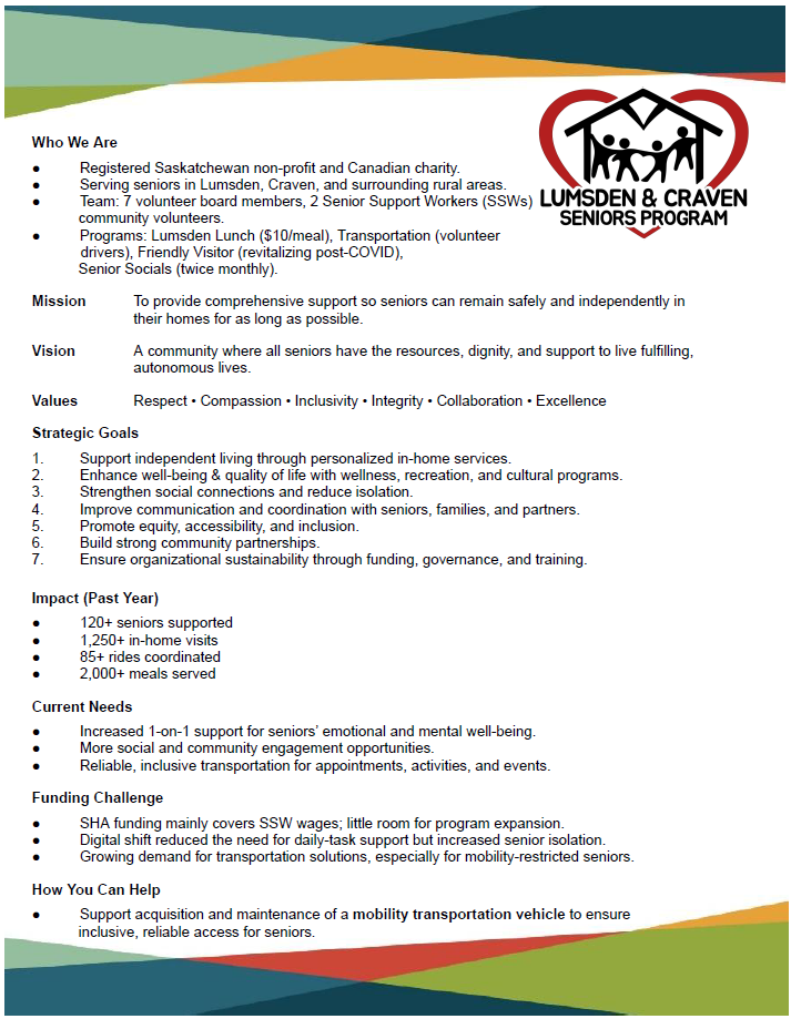The Lumsden & Craven Seniors Program provides seniors in the area with a Seniors Support Worker, transportation, in home visits, Lumsden Lunch Program and senior's social events.