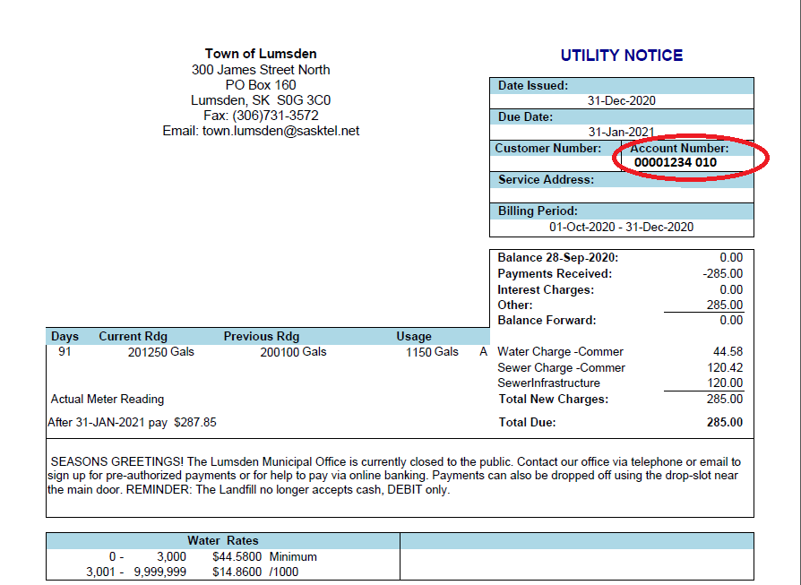 The Town of Lumsden has partnered with OptionPay. Using the Town's OptionPay, credit cards can be used to securely to pay for things such as property taxes, tickets and fines, utility bills, rental fees, permits and deposits and other accounts receivable invoices. There is a fee for this service. Click HERE to review the tiered fee rate table.