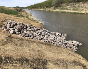 Rip rap of large boulders and matting protect the bank of the Qu’Appelle River.